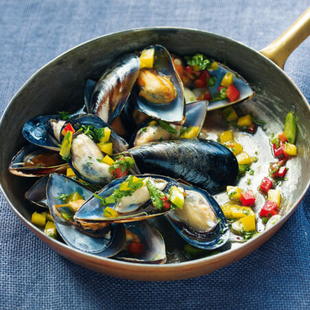 Die Muscheln unter kaltem Wasser abbürsten und die Bärte entfernen. Geöffnete oder beschädigte Muscheln wegwerfen. In einem Topf mit Dämpfeinsatz 5 cm hoch Wasser erhitzen. Die Muscheln darin portionsweise zugedeckt 4-5 Min. dämpfen, herausnehmen und lauwarm abkühlen lassen.