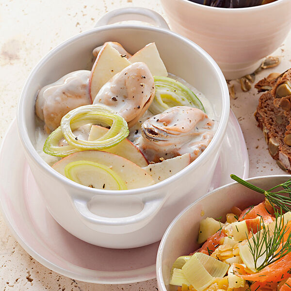 Muschelfleisch mit Lauch und Äpfeln unter die Salatcreme heben. Mit Brot servieren.