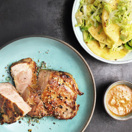 Das Fleisch in 8 Steaks (ca. 2 cm dick) schneiden. Mit der Marinade in den Ziplock-Beutel geben, verschließen und mit den Händen durchmischen. Ca. 4 Std. im Kühlschrank marinieren.
