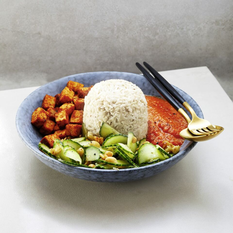 Zum Servieren die Linsen noch warm in den Rührbecher zur Paprika geben und alles mit dem Pürierstab fein pürieren, das Sambal salzen und pfeffern. Den Reis in der Mitte der Teller anrichten und Tempeh, Linsen-Sambal und Gurkensalat portionsweise danebensetzen.