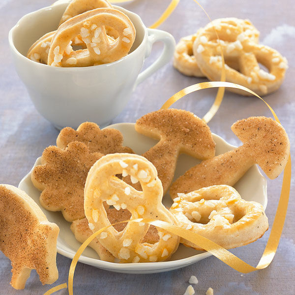 Für die Verzierung Eigelb und Sahne verquirlen. Die Brezeln damit bestreichen und mit Hagelzucker bestreuen. Im Ofen bei 200° (Mitte, Umluft 180°) ca. 20 Min. backen. Mit dem Papier vom Blech ziehen und abkühlen lassen.