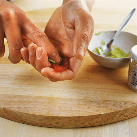Die Thunfischstücke jeweils auf einer Seite in der Mitte mit einer Fingerspitze Wasabipaste bestreichen.