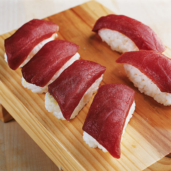 Das Thunfischfilet mit einem scharfen Messer quer zur Faser und leicht schräg in acht dünne, gleich große Scheiben von etwa 3 × 5 cm schneiden.