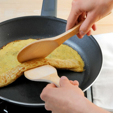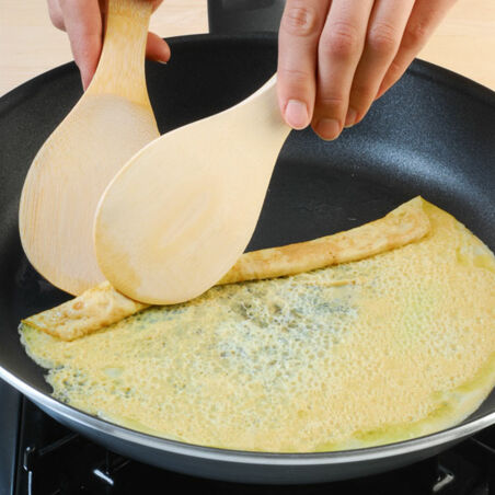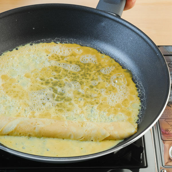 Eine beschichtete Pfanne mit niedrigem Rand (ideal: Crêpes-Pfanne) dünn mit Öl bepinseln. So viel Ei hineingeben, dass der Pfannenboden gerade gut bedeckt ist. Das Ei bei mittlerer Hitze leicht stocken lassen. Vom oberen Pfannenrand aus mit einem Holzspatel ca. 1,5 cm breit umklappen und so bis zum unteren Pfannenrand aufrollen.