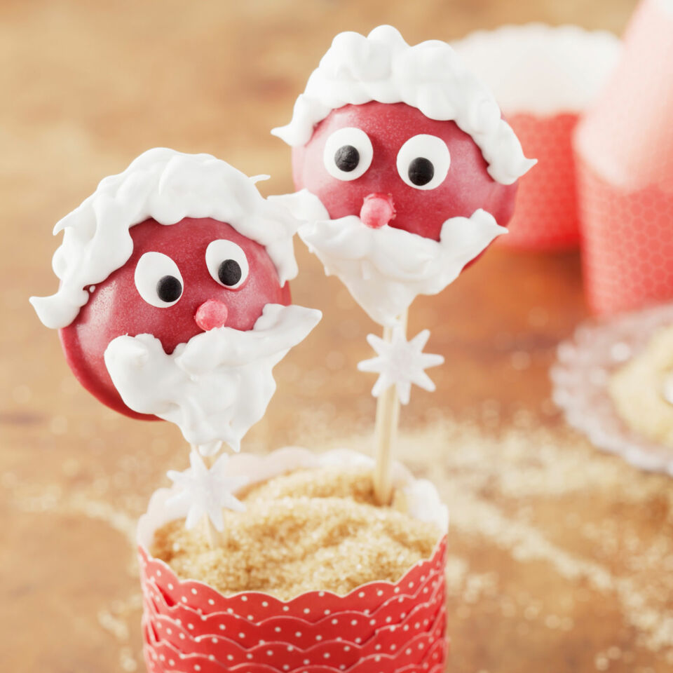 Die Cake-Pops einzeln mit den Candy-Melts (bei Bedarf nochmals erwärmen) überziehen. Mit je 2 Zuckeraugen und einer Zucker perlen-Nase verzieren. Die Spritzglasur in einen kleinen Gefrierbeutel füllen und diesen verschließen. Eine Ecke abschneiden und Mütze und Bart auf die Cake-Pops spritzen. Trocknen lassen.