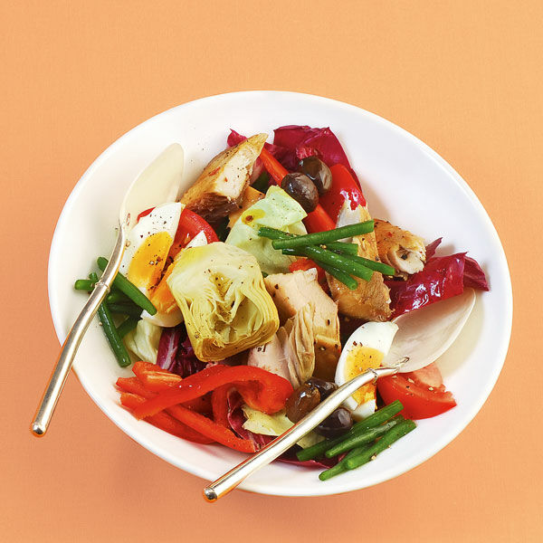 Die Paprikaschote waschen, vierteln, entkernen und nicht zu klein schneiden. Tomaten waschen, vom Stielansatz befreien und in Spalten schneiden. Artischocken abtropfen lassen und halbieren oder vierteln. Salat waschen, trocken schütteln, putzen und zerpflücken. Makrelenfilets häuten und klein schneiden. Eier pellen und sechsteln.