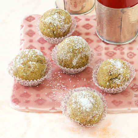 Die Mischung zu walnussgroßen Kugeln formen und in Zucker wälzen, in Pralinenhütchen setzen. Als kleine Leckerei zu orientalischem Tee servieren.