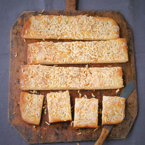Mit zwei Fingern Dellen in die Teigoberfläche drücken. Für den Belag die Butter in kleine Stücke schneiden und in jede Delle ein Butterstückchen geben. Die Mandelstifte über den Teig streuen.