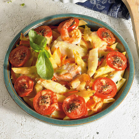 Dieser Nudelauflauf hat es in sich: Garnelen, Lachs und Kabeljau werden mit Möhren, Zucchini und Tomaten eingebacken.