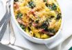 Backofen auf 190° vorheizen. Eier in eine Schüssel schlagen, Milch und eventuell Sahne dazugeben, mit Salz, Pfeffer und Muskat kräftig würzen. Nudeln, Schinken, Spinat und Zwiebeln mit der Eier-Milch-Mischung vermengen. Dabei ein Drittel des geriebenen Käses untermischen.