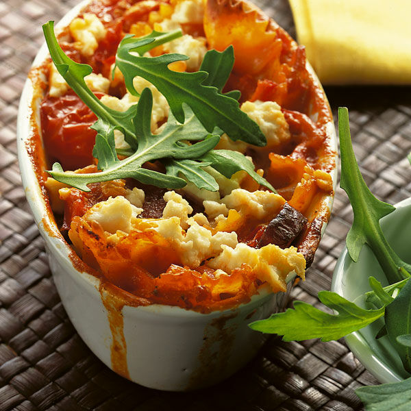Den Auflauf im Ofen (Mitte, Umluft 160°) ca. 40 Min. backen, davon die letzten 15 Min. zugedeckt. Rucola verlesen, waschen und trockenschütteln. Die Stiele entfernen, Blätter nach Belieben grob hacken, über das fertige Gericht streuen.