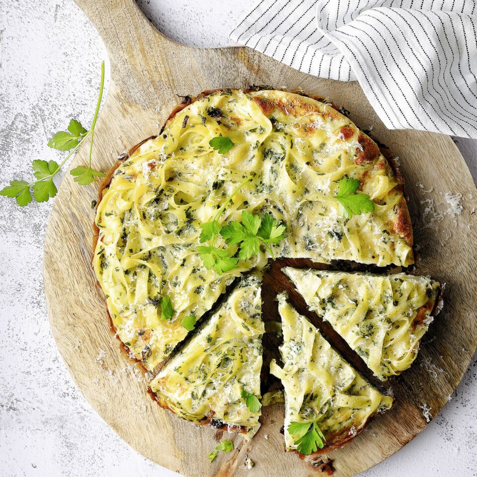Ein Nudel-Pfannkuchen für vier! Und ein gutes Resteessen, falls gestern Nudeln übriggeblieben sind.