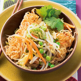 Fleisch und Nudeln untermischen. Alles zusammen 2-3 Min. sanft garen. Nudeln im Wok mit Kräuterblättchen bestreut servieren.