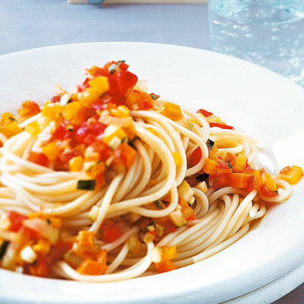 Inzwischen die Nudeln in Salzwasser nach Packungsanweisung bissfest kochen, abgießen, mit dem Gemüseragout mischen. In vorgewärmten Tellern servieren.