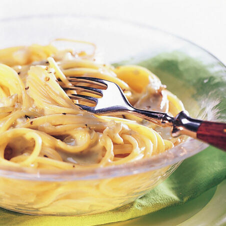Sauce mit Pfeffer und vorsichtig mit Salz (der Käse ist sehr würzig) abschmecken, mit den heißen Nudeln mischen und in tiefe Teller verteilen.