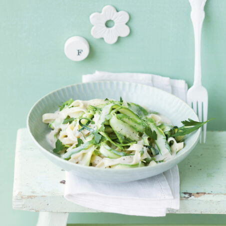 Nudeln in kochendem Salzwasser nach Packungsangabe bissfest garen. Ca. 3 Min. vor dem Ende der Garzeit die Spargelstreifen hineingeben und ca. 1 ½ Min. mitgaren. Die Zucchinistreifen dazugeben und 1-2 Min. mitkochen, bis das Gemüse bissfest ist. Nudeln und Gemüse in ein Sieb abgießen und abtropfen lassen, dann mit der Sauce mischen. Die Hälfte der Petersilie unterheben und den Rest darüberstreuen.