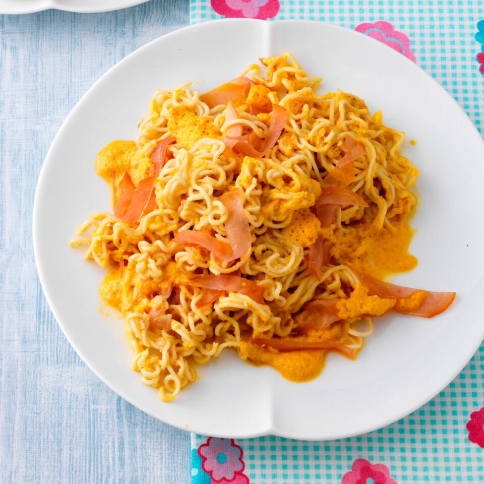 Inzwischen die Mie-Nudeln mit kochendem Wasser überbrühen, salzen und nach 2 Min. abgießen. Den Putenschinken in Streifen schneiden.