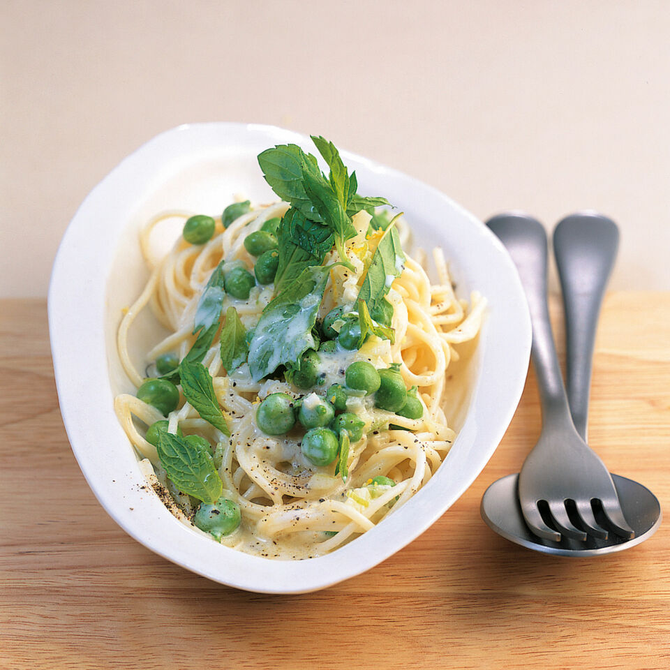 Speck und Eier bleiben heute im Kühlschrank. Für eine frühlingsfrische Vegi-Carbonara braucht es nur frische Erbsen, ein bisschen Zitrone und ein paar Minzblättchen.