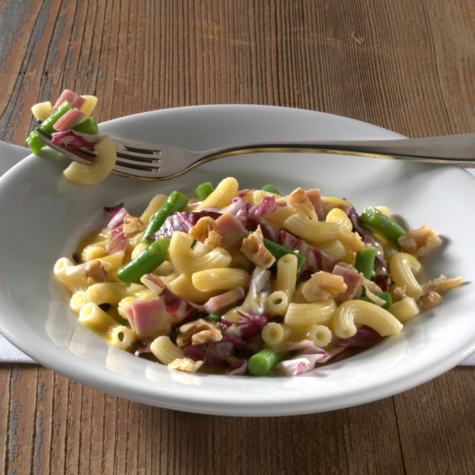 Die Bohnen putzen und in 2 cm lange Stücke schneiden. In frischem kochendem Salzwasser in ca. 10 Min. bissfest kochen, in kaltem Wasser abschrecken und in einem Sieb abtropfen lassen. Den Radicchio waschen, trockenschwenken, vierteln und in feine Streifen schneiden. Die Bohnen und die Salatstreifen unter die Nudeln mischen.
