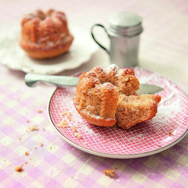 Das Mehl mit dem Backpulver auf die Eimasse sieben und mit einem Teigspatel rasch unterheben. Den Teig in die Förmchen füllen. Die Küchlein im Ofen (Mitte) 15–20 Min. backen. Herausnehmen, etwas abkühlen lassen, dann aus den Förmchen lösen und auf einem Kuchengitter ganz abkühlen lassen. Die Küchlein mit Puderzucker bestäuben.