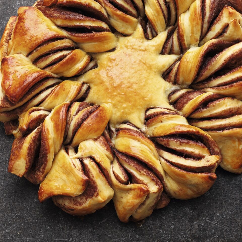 Ein Glas (5 cm Ø) mittig auf den Teigstapel stellen und den Teig bis zum Glas in 12 Tortenstücke schneiden. Dann jedes Tortenstück zweimal in sich verdrehen. Eigelb und Milch verquirlen und den Stern damit bestreichen. Den Stern im Ofen (Mitte) ca. 12 Min. backen. Herausnehmen und auf einem Kuchengitter auskühlen lassen.