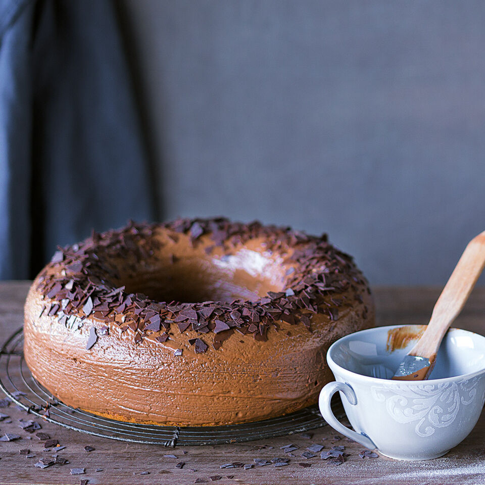 Den Kuchen aus dem Backofen nehmen und in der Form auf einem Kuchengitter abkühlen lassen. Den Haselnussguss in einer Schüssel über dem heißen Wasserbad schmelzen lassen. Den abgekühlten Kuchen aus der Form nehmen und mit dem Guss überziehen. Zum Schluss die Schokoraspel über den Guss streuen und den Guss bis zum Servieren trocknen lassen.