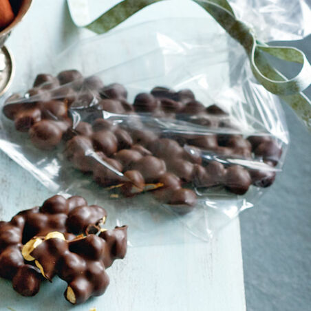 Die Kuvertüre in einer Schüssel im Wasserbad langsam schmelzen und die Gewürze unterrühren. Die Nüsse darin wenden. Eine Platte mit Backpapier belegen und die Schoko-Nussmischung daraufgießen. Etwas verteilen. Richtig erkalten und fest werden lassen. Die Nussmischung in mittelgroße Stücke brechen und in Zellophantütchen verpacken.