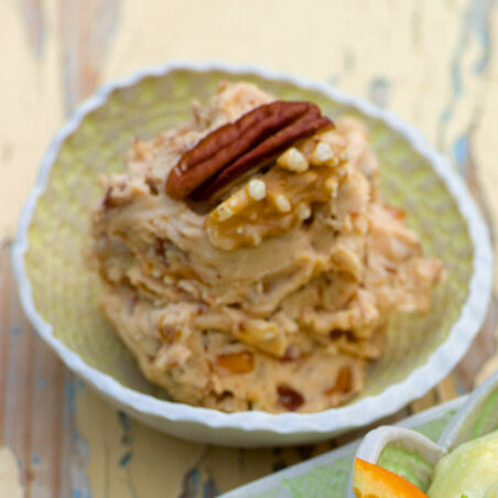 Den Quark mit dem Ahornsirup glatt rühren. Die Quarkmasse mit Erdnusscreme und gehackten Nüssen verrühren. Die Creme in eine Schüssel füllen und zugedeckt kalt stellen. Vor dem Büfettaufbau mit den übrigen Nüssen bestreuen.
