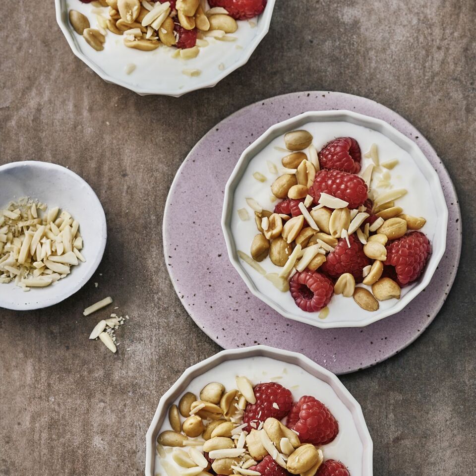 Den Magerquark und den Joghurt in einer Schüssel zu einer glatten Creme verrühren. Die Creme auf Schälchen verteilen. Zuerst die Himbeeren daraufgeben, anschließend die Erdnüsse und die Mandelstifte.