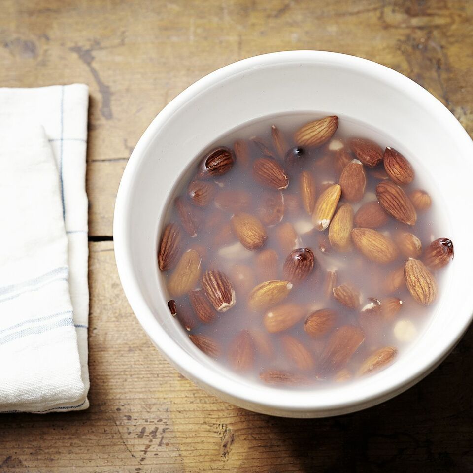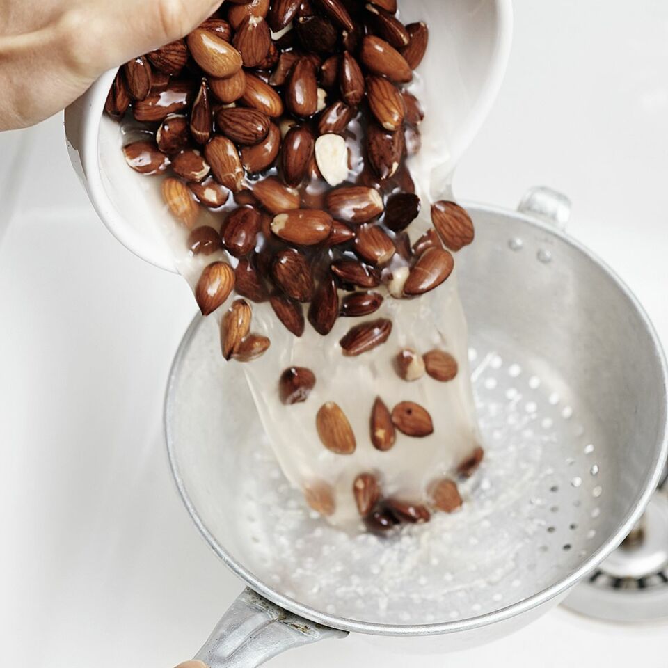 Die Mandeln in eine Schüssel geben, mit reichlich Wasser begießen (ca. ½ l) und zugedeckt über Nacht einweichen. Am nächsten Tag die Mandeln in ein Sieb abgießen und gut abbrausen, abtropfen lassen.