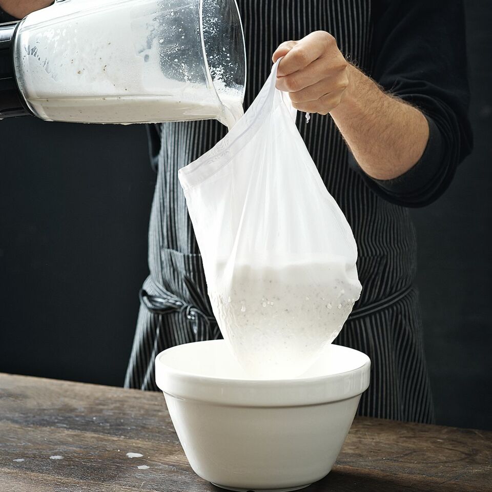 Nussmilchbeutel: Wer häufig Nussmilch selber macht, sollte sich einen Nussmilchbeutel zulegen, mit dem sich die Nussmasse bequem sehr gut filtern und auswringen lässt. Die Milch hält dann gut gekühlt sogar 3-5 Tage.