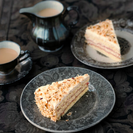 Für die Dekoration die Haselnussblättchen in einer Pfanne ohne Fett kurz bräunen, bis sie zu duften anfangen. Herausnehmen und abkühlen lassen. Die Torte aus der Form lösen. Die Sahne steif schlagen. Die Oberfläche und den Rand der Torte mit der Sahne einstreichen und mit den Haselnussblättchen bestreuen. Vor dem Servieren mind. 2 Std. kühlen.