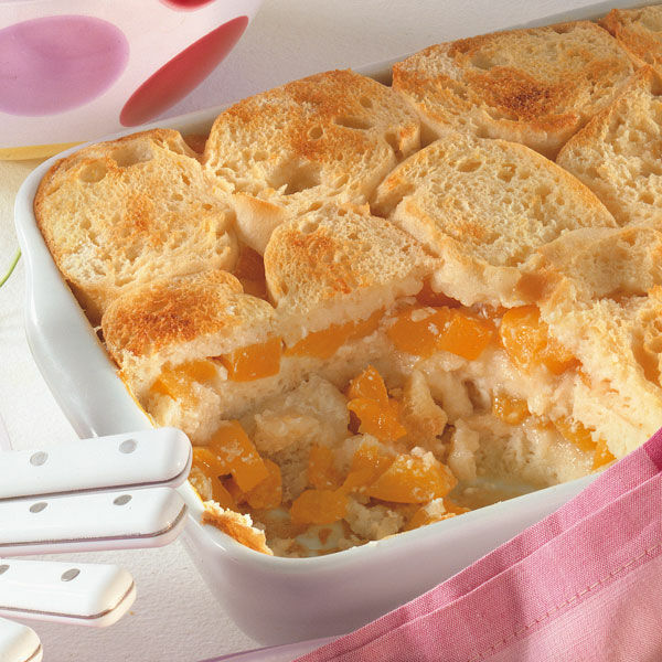 Eine feuerfeste Form mit etwas Butter ausstreichen. Brotmasse und Früchte lagenweise einschichten. Die restliche Butter in Flöckchen schneiden und auf der Oberfläche verteilen. Den Auflauf im heißen Ofen (Mitte, Umluft 160°) etwa 35 Min. backen, bis er schön gebräunt ist. Leicht abgekühlt servieren.
