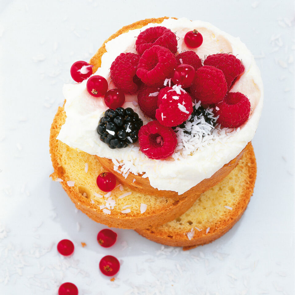 Gläser aus dem Ofen nehmen. Zum Aufbewahren heiß verschließen, die Biskuitkuchen halten sich kühl gelagert ca. 6 Wochen. Zum Servieren Beeren verlesen. Biskuit abgekühlt aus den Gläsern stürzen und in jeweils 4 Scheiben schneiden. Jeweils Oberfläche und Rand der Biskuitscheiben mit 2 EL Mangosirup beträufeln. Sahne steif schlagen, Mascarpone und restlichen Mangosirup unterrühren. Mascarpone-Sahne auf den Biskuitscheiben verteilen, mit den Beeren belegen. Kuchen mit Kokosraspeln bestreuen.