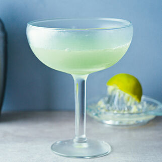 Den Inhalt des Shakers durch das Barsieb in das Glas gießen. Die Karambolenscheibe bis zur Mitte einschneiden und an den Glasrand stecken.