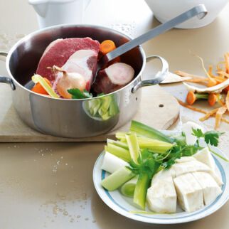 Das Wasser aufkochen, dabei den Schaum mit einer Schaumkelle entfernen. Das Fleisch und die Knochen zugedeckt bei kleiner Hitze 3-4 Std. köcheln lassen.
