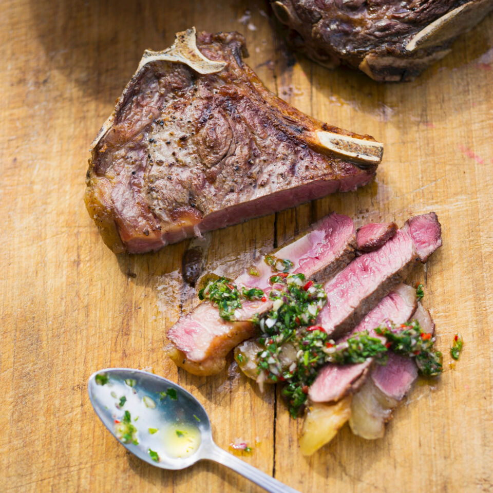 Beim rosa gebratenen Ochsenkotelett werden nicht nur Cowboys schwach. Die würzige Chimichurri-Sauce macht den Genuss perfekt.