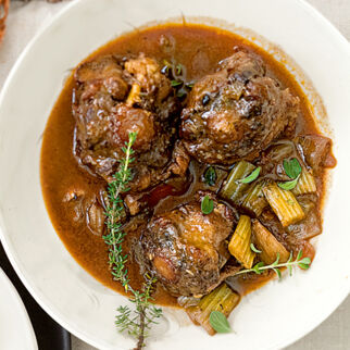 Den Bräter in den Ofen (unten, Umluft 160°) schieben und den Ochsenschwanz 2 Std. 30 Min.-3 Std. zugedeckt schmoren lassen (das Fleisch sollte schön weich sein und sich leicht vom Knochen lösen lassen), dabei zweibis dreimal umrühren. Rosinen mit 3 EL Essig mischen und ziehen lassen, nach der Hälfte der Garzeit unter das Fleisch rühren.