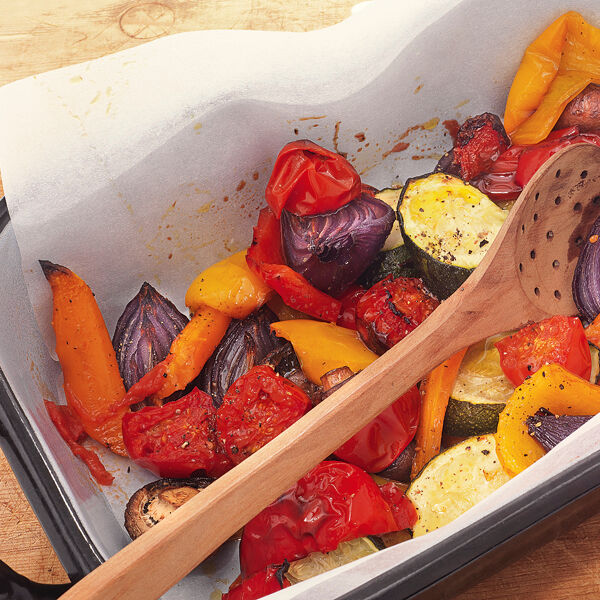 Das Gemüse mit 4 EL Olivenöl, Salz und Pfeffer in einer feuerfesten Form oder in einem tiefen Backblech mischen. Im Ofen (Mitte) in etwa 30 Minuten goldbraun und weich backen, dabei ab und zu durchrühren.