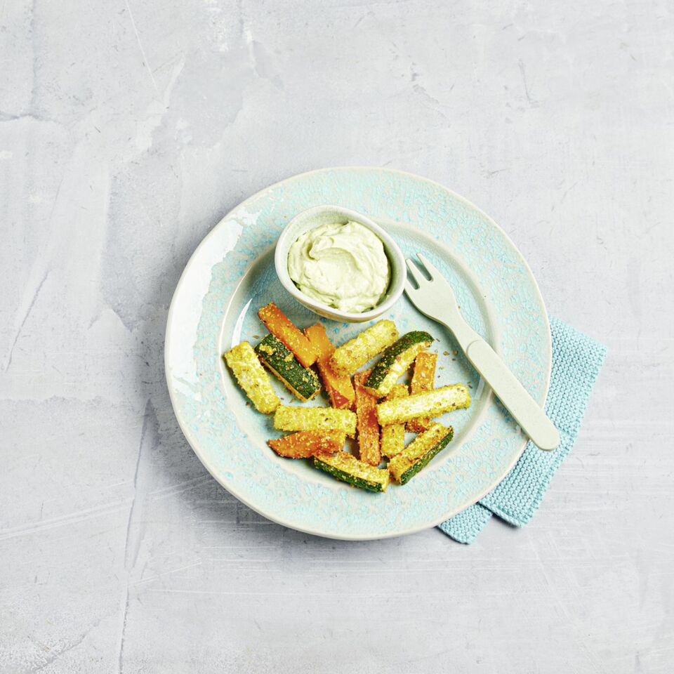 Dieses einfache Gericht für Groß und Klein geht immer. Knuspriges Gemüse mit leichter Polenta-Kräuter-Kruste und Avocado-Quark.