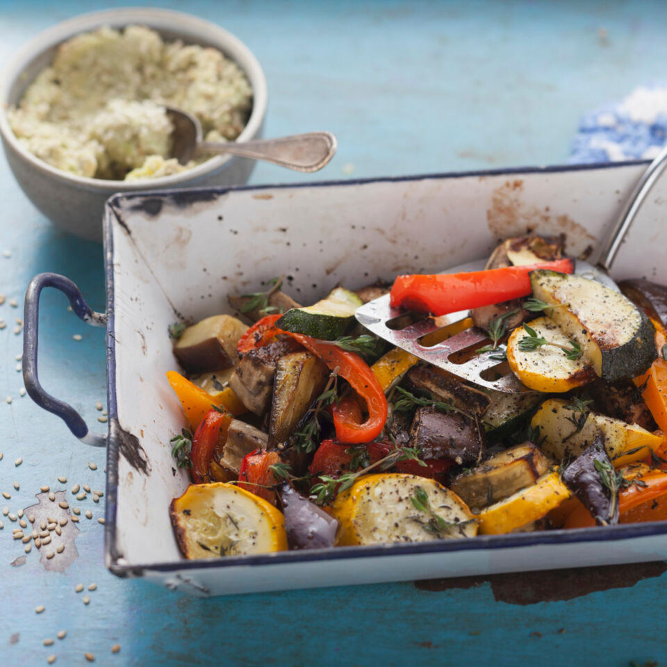 Nach ca. 10 Min. Backzeit das Gemüse auf dem Blech wenden und mit Sesam bestreuen. Dann das Ofengemüse fertig backen, herausnehmen und mit der Tofu-Guacamole servieren.