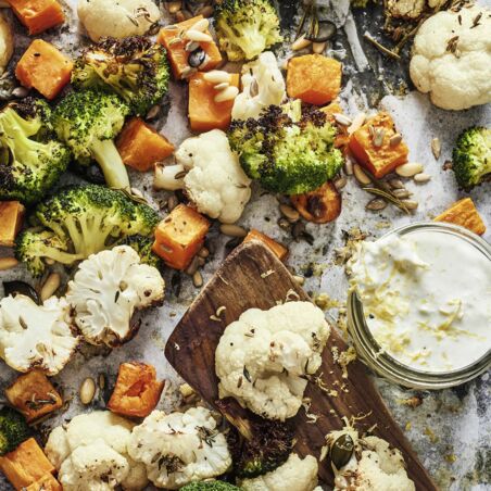 Tipp: Statt Süßkartoffeln schmecken auch Möhren, Rote Bete oder Hokkaido-Kürbis. Statt Blumenkohl passen Fenchelknolle oder Pastinake, statt Brokkoli Rosenkohl.