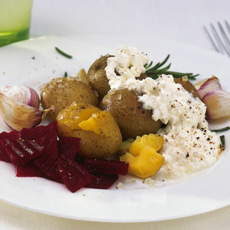 In der Zwischenzeit den Frischkäse mit dem Meerrettich verrühren und mit Salz und Pfeffer abschmecken. Die Rote Bete gut abtropfen lassen, auf zwei Teller verteilen, die Kartoffeln und die Knoblauchzehen daneben anrichten und den Frischkäse auf die Kartoffeln geben.