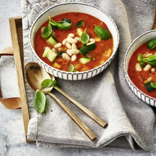 Inzwischen das Basilikum waschen und trocken schütteln. Die Blätter von den Stielen zupfen und mit 2 EL Öl im Blitzhacker fein pürieren. Das Basilikumöl mit etwas Salz abschmecken.