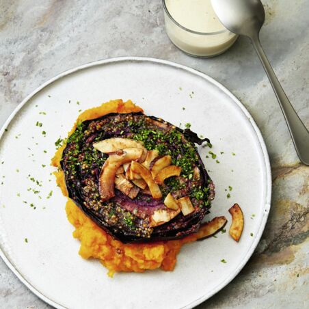 Den Backofen auf 190° vorheizen. Den Rotkohl waschen, abtropfen lassen, putzen und von welken Blättern befreien. Aus dem Kohlkopf 4 Scheiben von 3-4 cm Breite schneiden, den übrigen Rotkohl anderweitig verwenden. Ein tiefes Backblech mit Backpapier auslegen, die Rotkohlscheiben dicht an dicht darauflegen und 150 ml Wasser angießen. Das Blech in den Backofen (Mitte) schieben und für 26 Min. backen.
