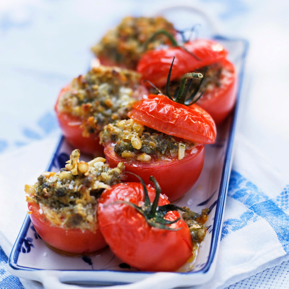 Den Backofen auf 200° (Umluft 180°) vorheizen. Die Tomaten waschen, quer halbieren und mit den Schnittflächen nach oben in eine ofenfeste Form setzen, salzen und pfeffern. Pinienkerne grob, Kapern und Sardellen fein hacken und mit Semmelbröseln, Parmesan, Kräutern und Öl mischen, dabei alles gut vermengen. Die Bröselmasse leicht salzen und pfeffern.
