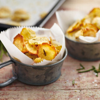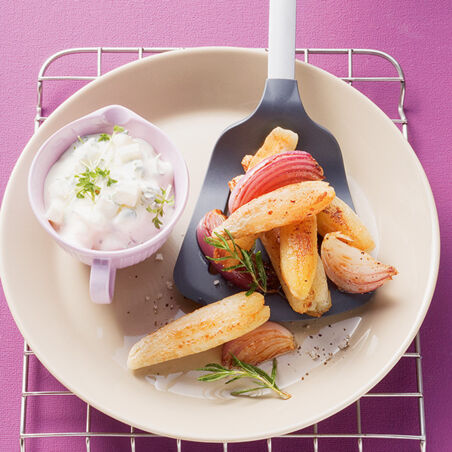 Den Backofen auf 180° vorheizen. Die Topinamburknollen wie Kartoffeln schälen, größere halbieren. Die Zwiebeln schälen und halbieren. Den Rosmarin waschen und trocken schütteln. Nadeln abzupfen.