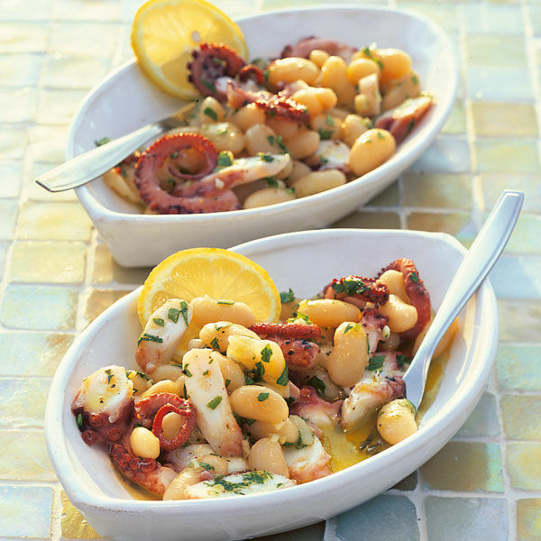 Petersilie waschen, Blättchen sehr fein hacken. Knoblauch schälen und fein schneiden. Zitronensaft mit Öl verrühren, mit Salz und Pfeffer abschmecken. Bohnen und Oktopus mit der Sauce, Petersilie und Knoblauch mischen und abschmecken. Salat vor dem Servieren etwa 1 Std. kühl stellen. Mit Zitronenschnitzen garniert servieren.