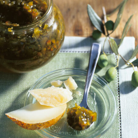 Die Oliven müssen vor ihrer Verwendung lange Zeit gewässert werden. Die fertige Konfitüre passt als Vorspeise oder kleiner Snack toll zu jungem Pecorino.