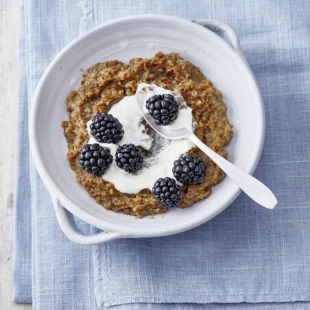 Für das Topping den Schmand glatt rühren. Die Brombeeren vorsichtig waschen und trocken tupfen. Das Øllebrød auf vier Schälchen verteilen. Je 1 EL Schmand daraufgeben, die Brombeeren daraufstreuen und warm oder kalt servieren.